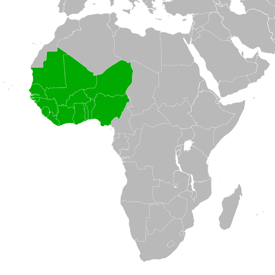 - Benin, Burkina Faso, Cabo Verde, Côte d'Ivoire, Gambia, Ghana, Guinea, Guinea-Bissau, Liberia, Mali, Mauritania, Niger, Nigeria, Senegal, Sierra Leo, Togo